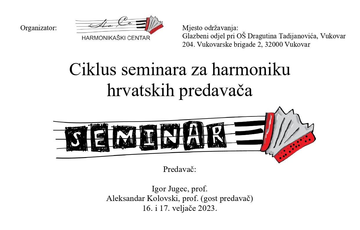 3. seminar u sklopu Ciklusa za harmoniku hrvatskih predavača održati će se 16. i 17. veljače 2023. godine u Vukovaru, Glazbeni odjel pri OŠ Dragutina Tadijanovića